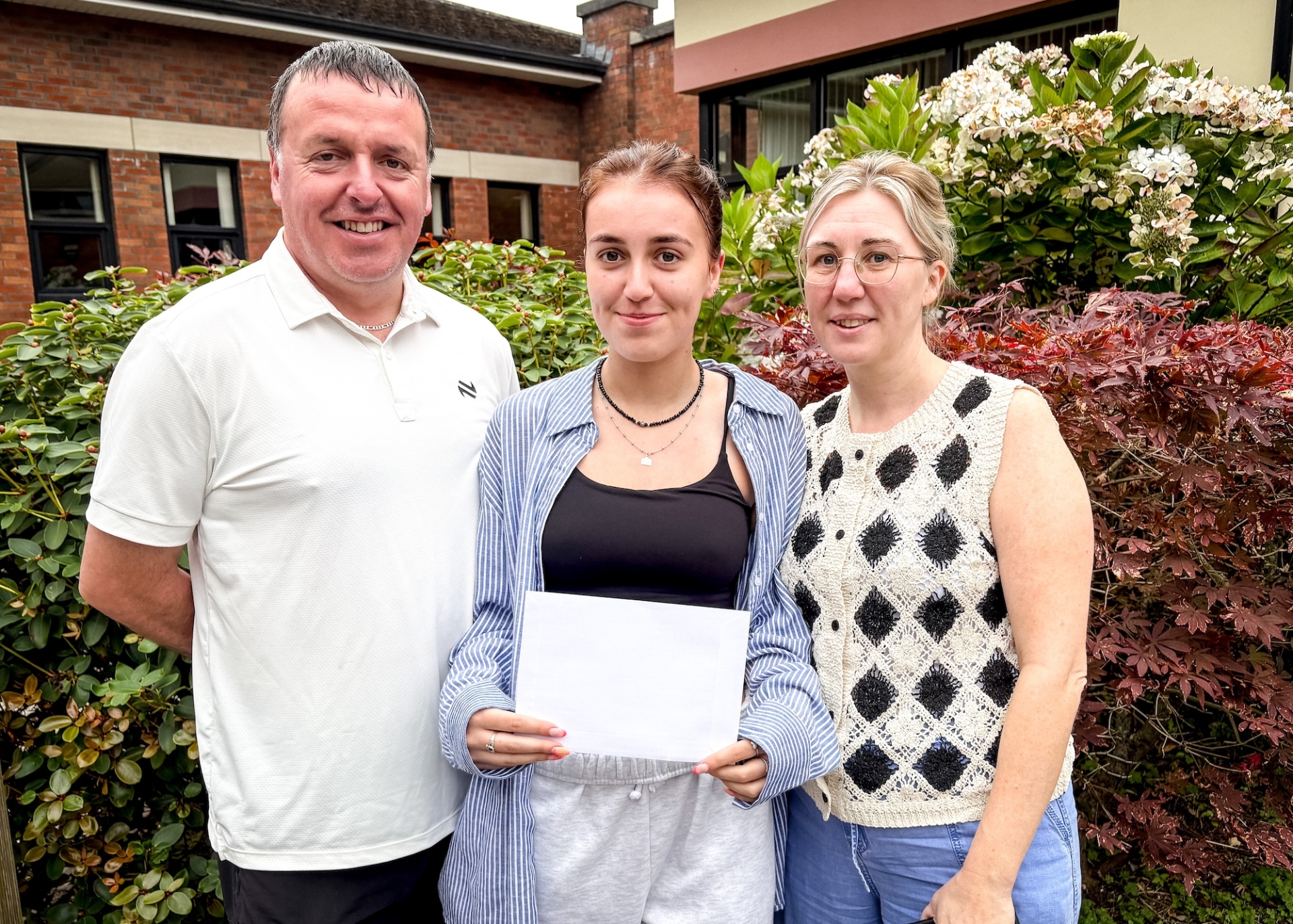 Bronagh O’Kane shares her A Level success with her parents in Thornhill College