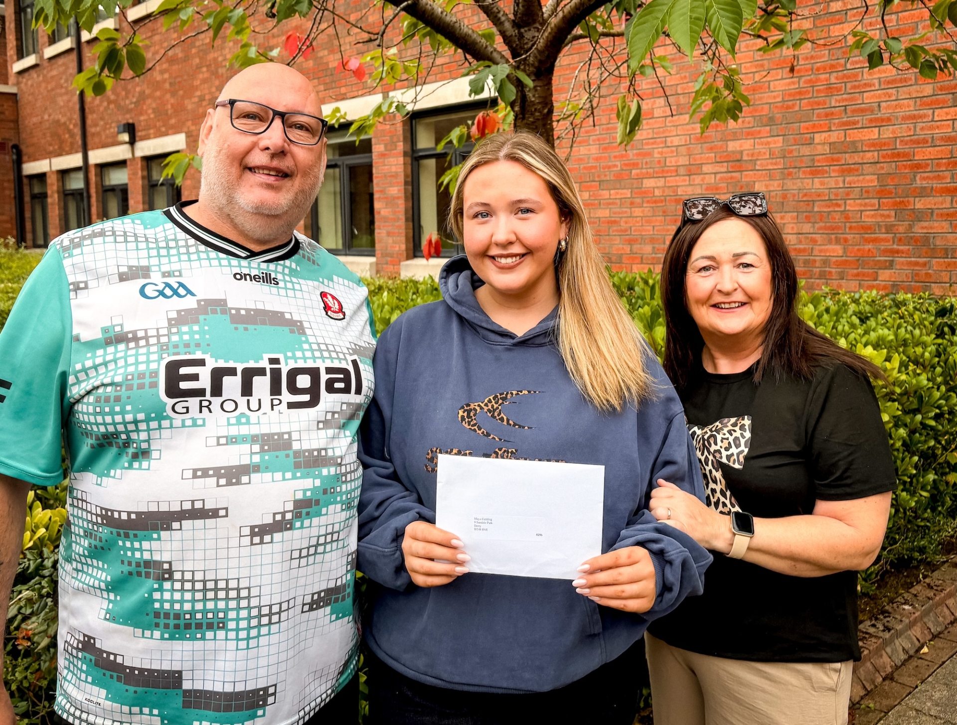 Maya Fielding pictured with her parents as she receives her examination results in Thornhill College