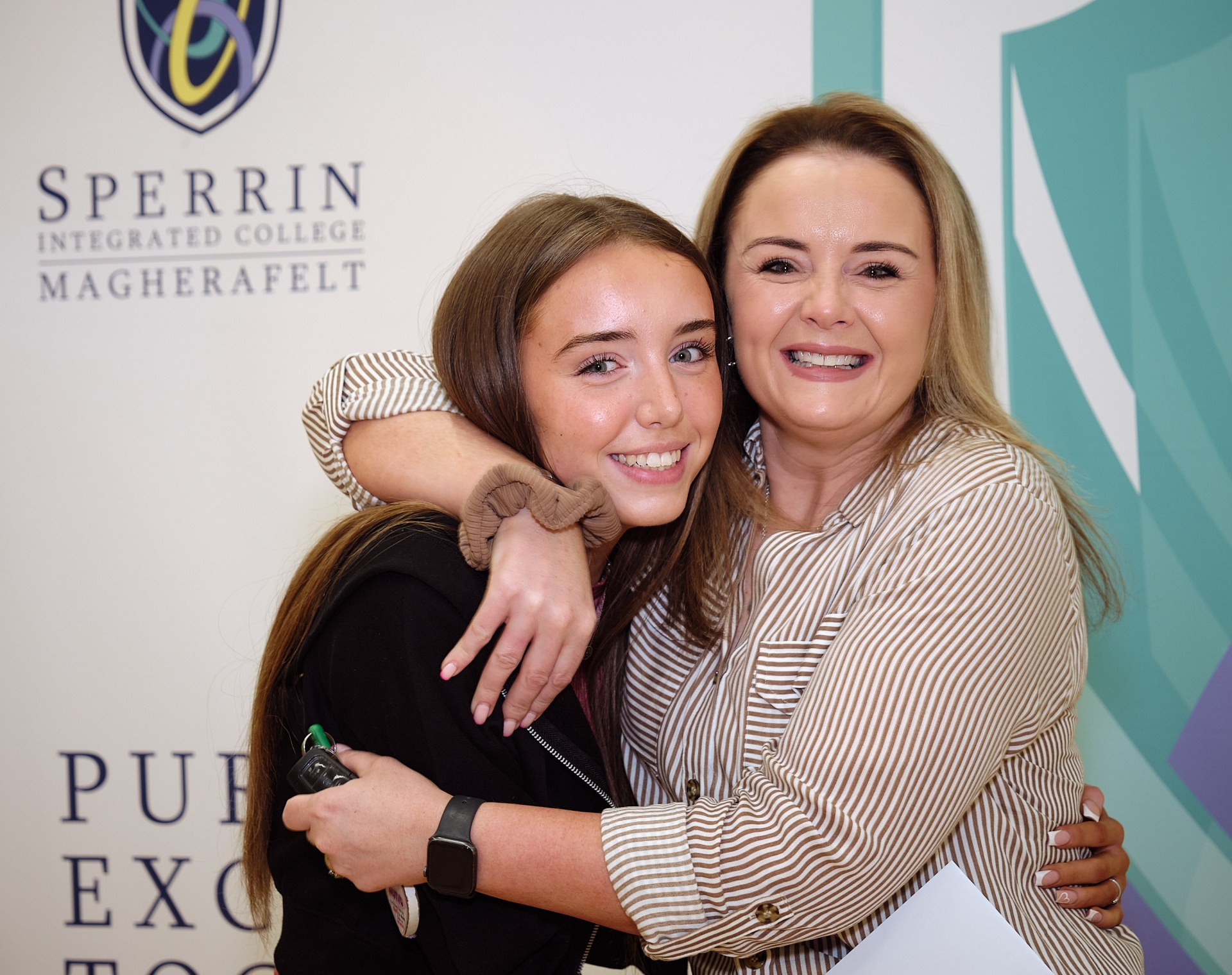 Taylor McMullan gets a big hug from her mum when she received her GCSE results at Sperrin Integrated College, Magherafelt. (Photos: Adrian Robinson)