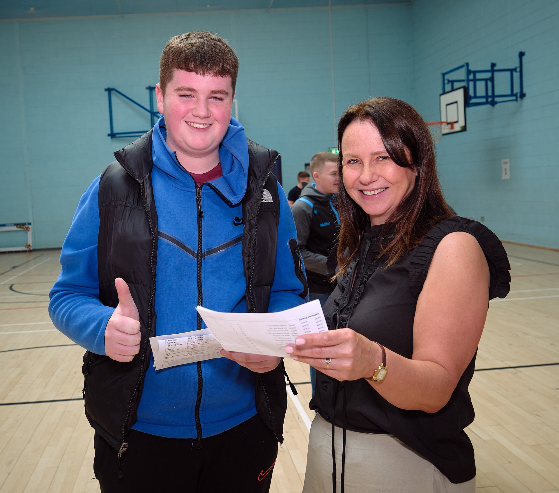 It’s a ‘thumbs up’ for this St Pius X College GCSE student as he is pictured with his happy teacher. (Photos: Adrian Robinson)