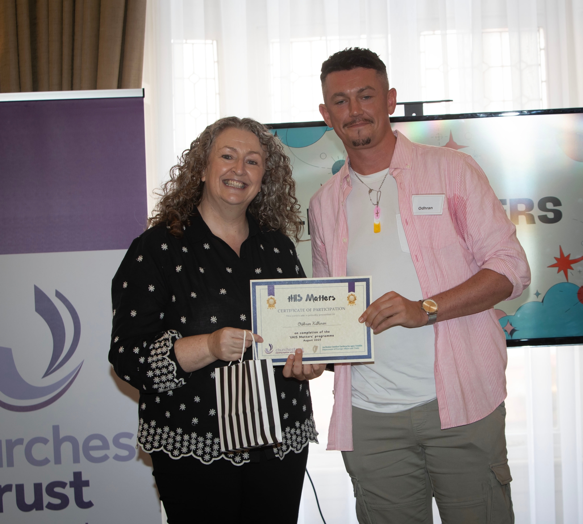 Mary Holmes, Chief Executive Officer, Churches Trust, presenting a certificate to Odhran Killoran.