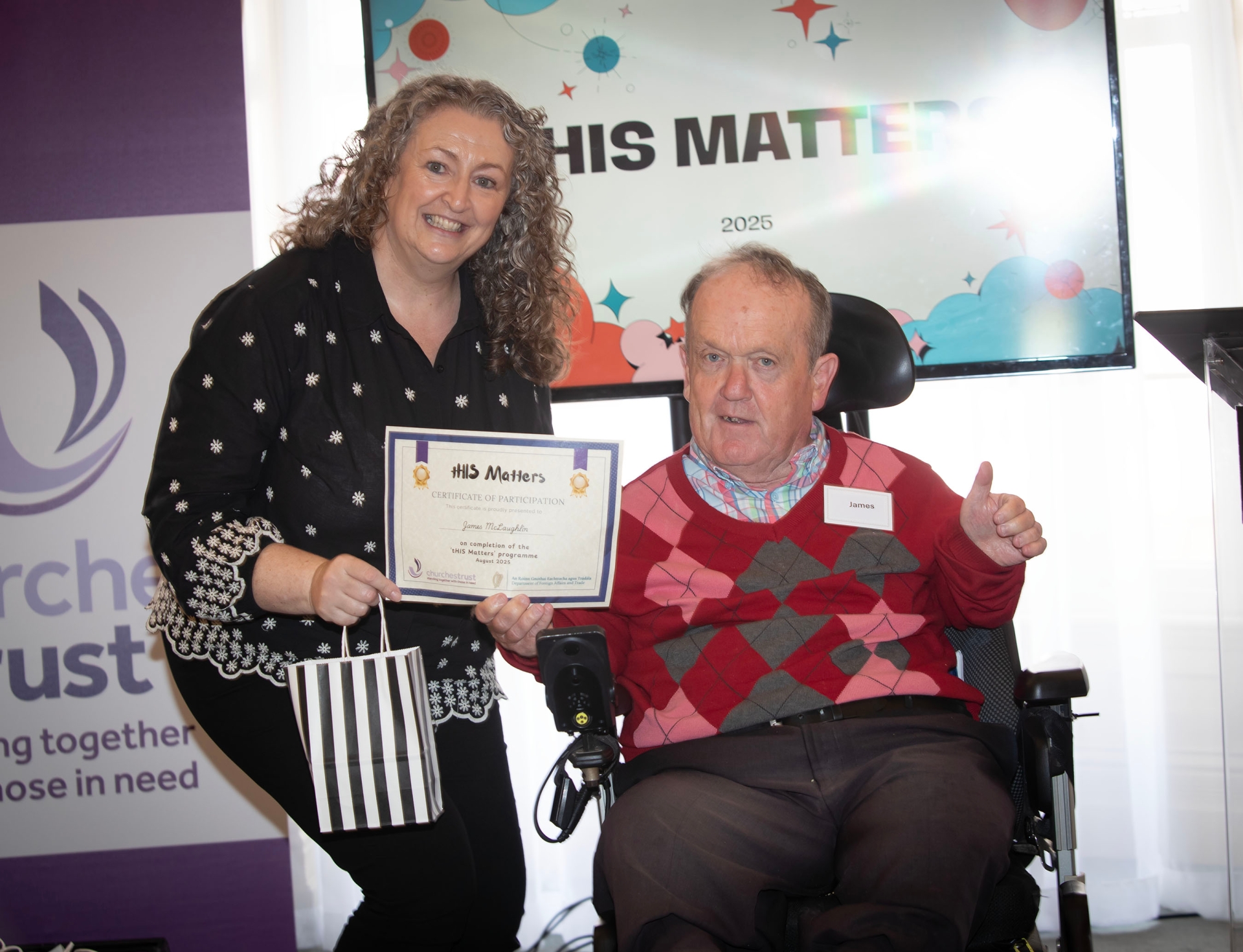 Mary Holmes, Chief Executive Officer, Churches Trust, presenting a certificate to James McLaughlin.