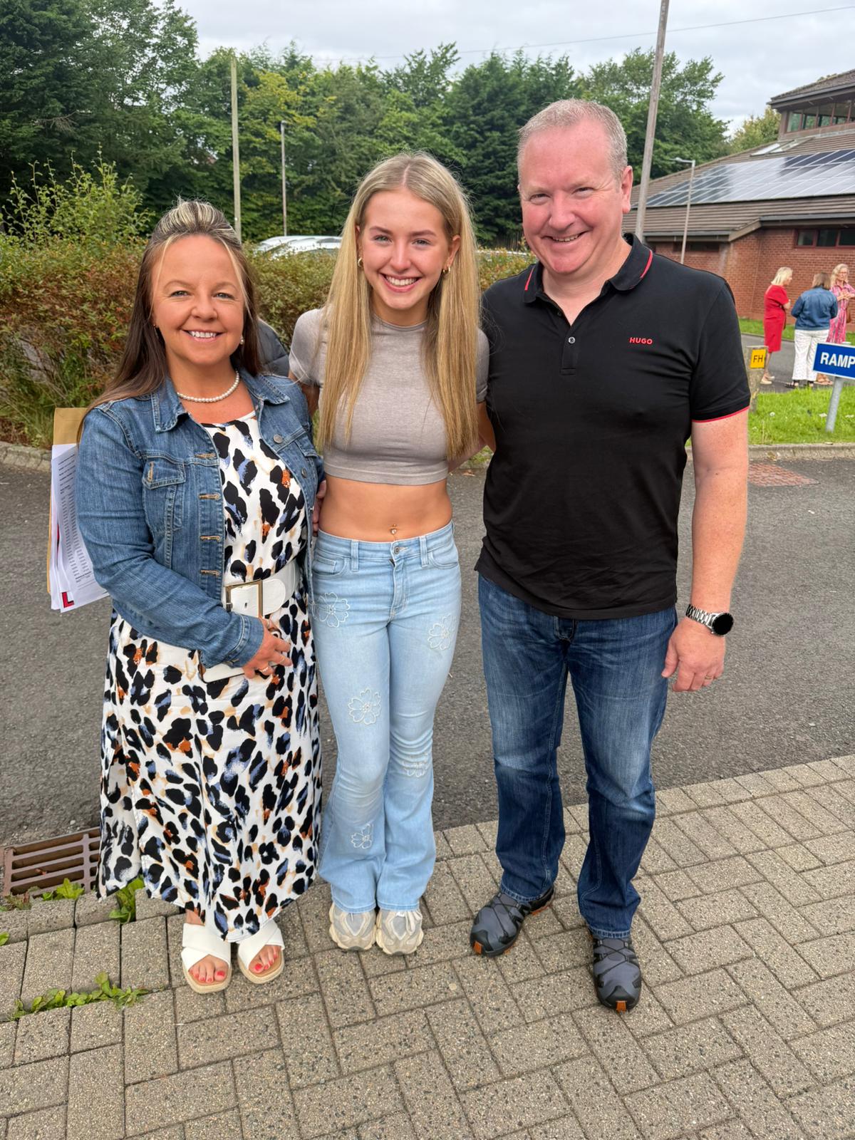 Aoife Dempsey celebrates her exceptional ten A* grades with her mum and dad.
