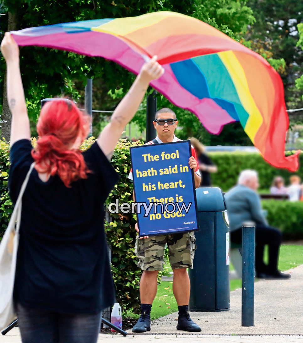 A woman waves the Rainbow Gay Pride flag with a protester against the Foyle Pride Parade in the background.