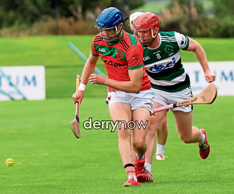 Lavey's Brendan Laverty prepares to collect the sliotar, on his heels Na Magha's Michael Lynch.
