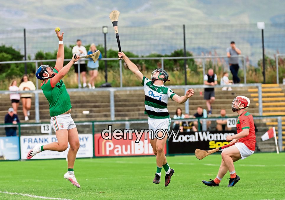 Lavey's keeper Eoin Mullholland prepares to grab the sliotar to deny Na Magha a score. (Photos - Tom Heaney, nwpresspics)
