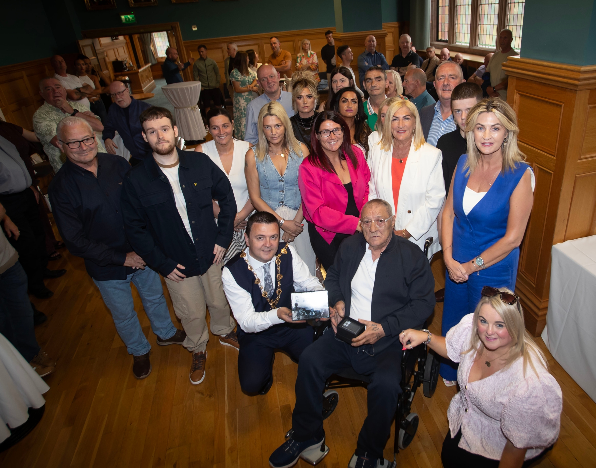 The Mayor, Ruari McHugh making a special presentation to the family of Eamonn 'Bronco' Bradley, during a reception in the Guildhall on Friday evening to mark the Eamonn 'Bronco' Bradley tournament's 40th anniversary. Included in photo is Martin McGilloway, chair and Councillor Sandra Duffy.