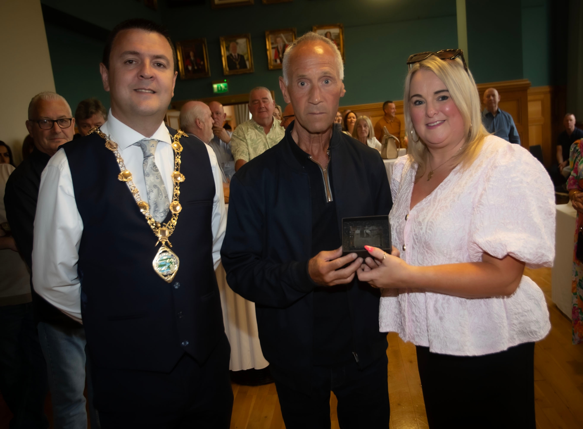 Councillor Sandra Duffy makes a special presentation to Martin Sheehan, Celtic Bar, main sponsors of the Eamonn 'Bronco' Bradley Football Tournament. On left is the Mayor, Ruairi McHugh.