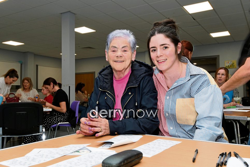 Enjoying the Bingo for Palestine fundraising evening in Shantallow Community Centre were Kathleen Phelan and Natalie Chada.