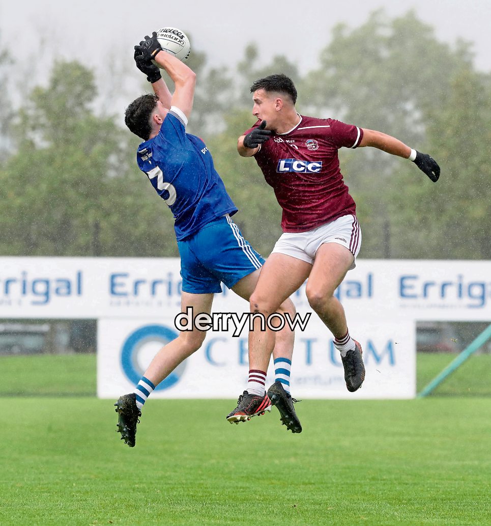 Bellaghy Karl McCallion rises highest under the challenge of Slaughtneil's Meehaul McGrath.