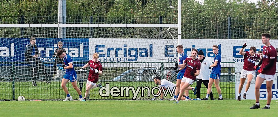 Slaughtneil celebrate a goal against Bellaghy by Cahal McKaigue, on right, during the Derry SFC match at Owenbeg.(Photos: Margaret McLaughlin)