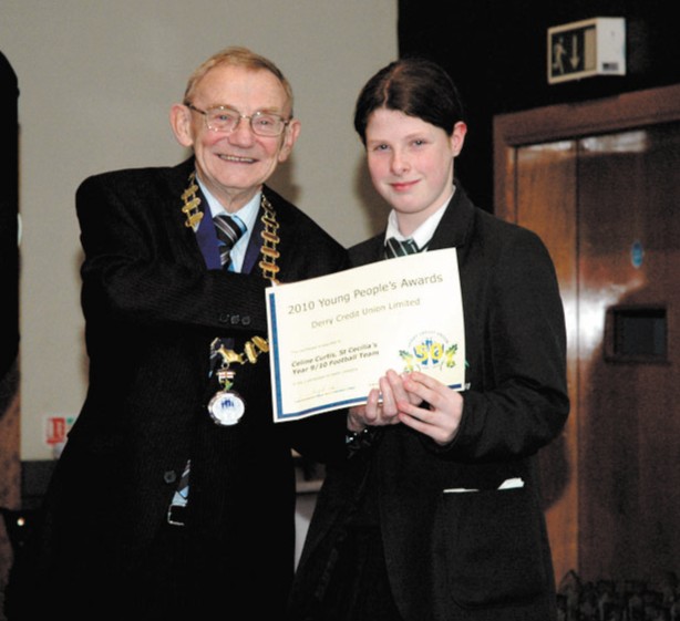 Celine Curtis receives a certificate from Jim Travers on behalf of St Cecilia’s football team