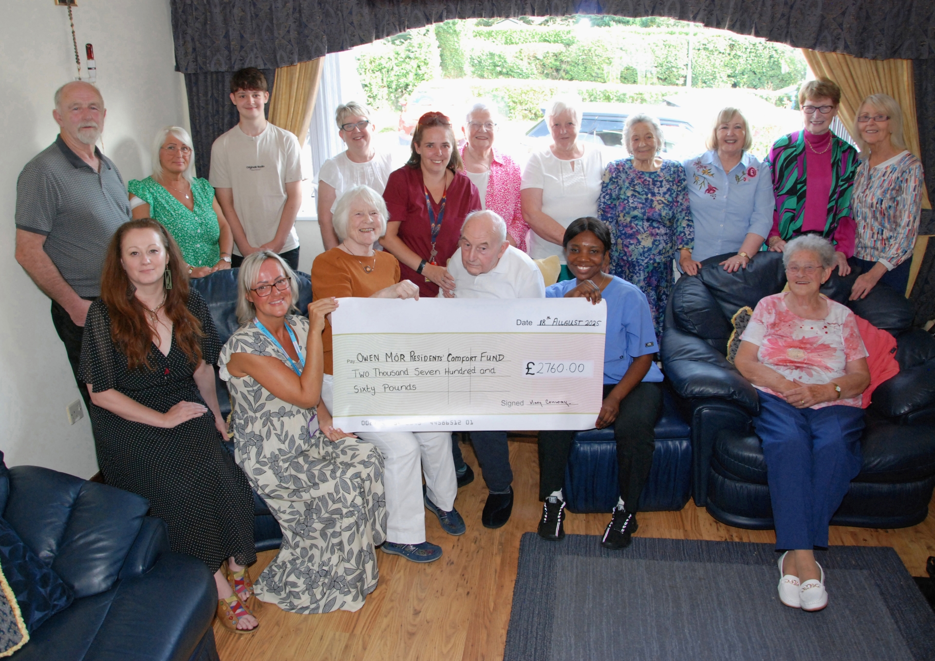 Main organiser of the coffee day - Mary Conway pictured with her husband Seamus (Front Row L-R third and fourth) who is a resident, presenting a cheque for £2,760.00 to the staff at Owen Mor Care Centre, Culmore, Derry. All proceeds will go towards the residents comfort fund. Also pictured are those who helped out and organised the coffee day. (Photos: Rosemarie Lynn)