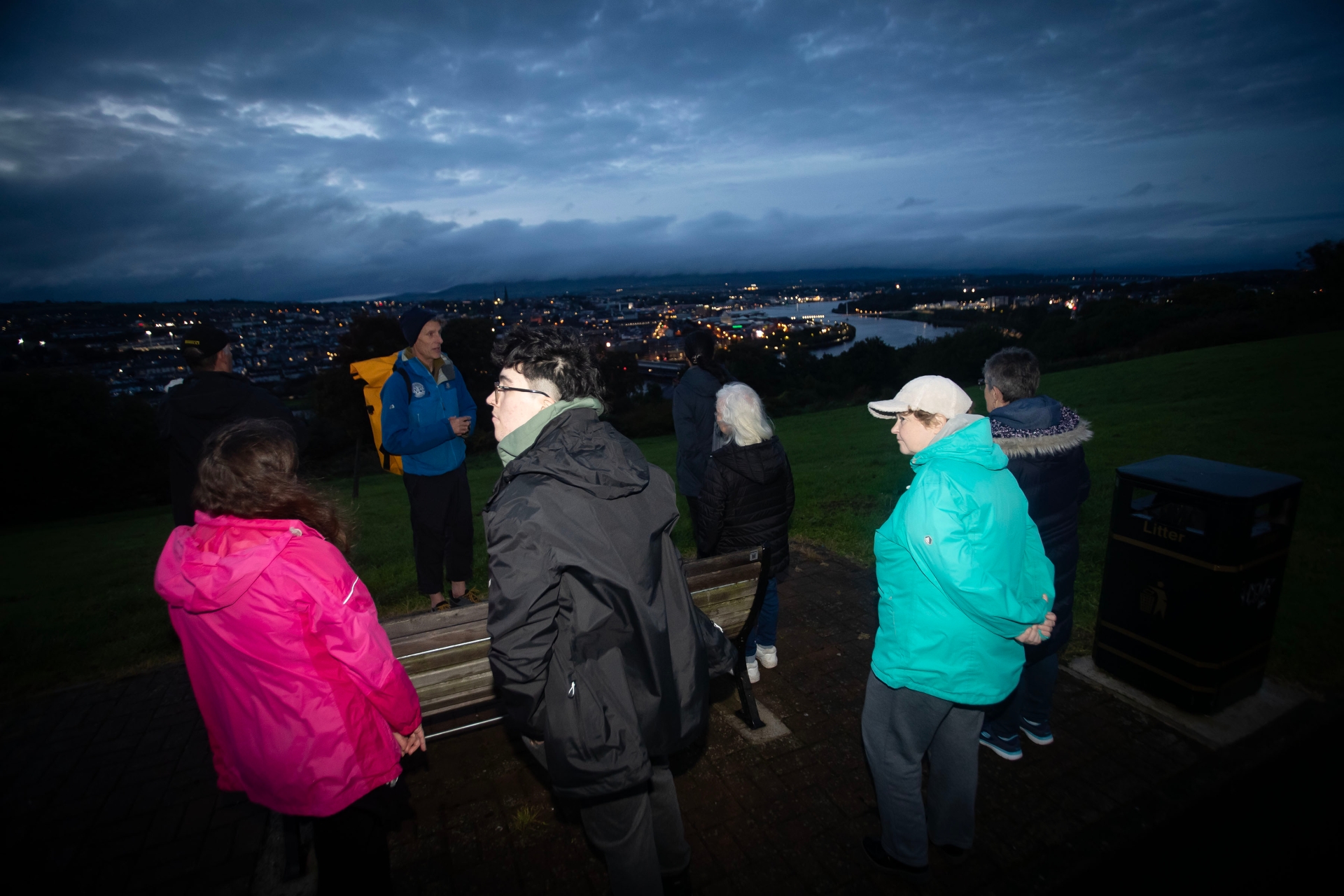 Tour Guide Lorcan McBride gives a brief history of the area as the walkers stop off at Eskaheen View in the Waterside.