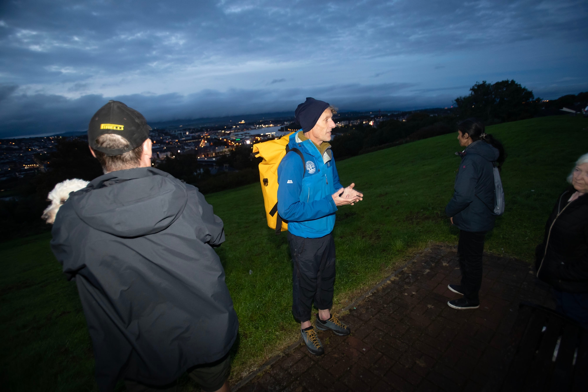 Tour Guide Lorcan McBride gives a brief history of the area as the walkers stop off at Eskaheen View in the Waterside.