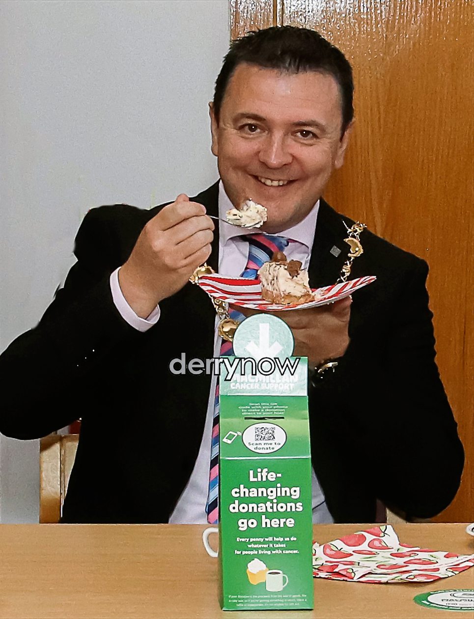 Mayor Ruairí McHugh enjoying a piece of cheese cake at a MacMillan Cancer support Coffee Morning held in Creggan Library.
