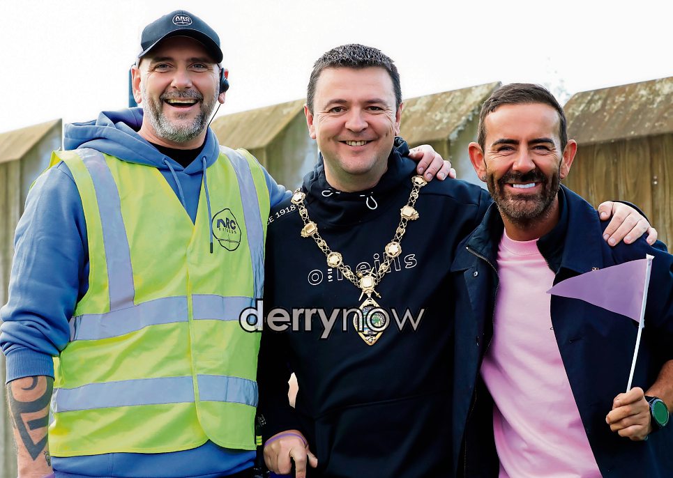 Mayor Ruairí McHugh with Gary Rutherford and local celebrity Mickey Doherty at the Arc Fitness annual recovery walk.