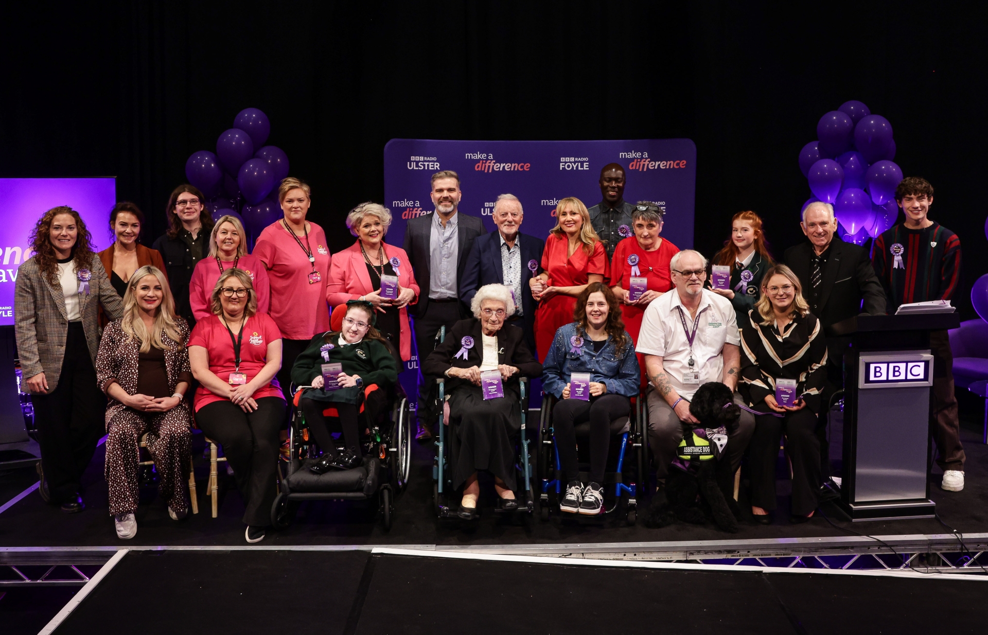 PICTURED BELOW: The winners of the inaugural BBC Make a Difference Awards in Northern Ireland hosted by BBC Radio Ulster and BBC Radio Foyle with presenters Vinny Hurrell and Cate Conway and judges. The judges were Holly Hamilton, Joel M, Dara McAnulty, Hugo Duncan MBE, Kwame Daniels, Kerri Quinn, Marissa Callaghan and Anne-Marie Wallace (not in photo).