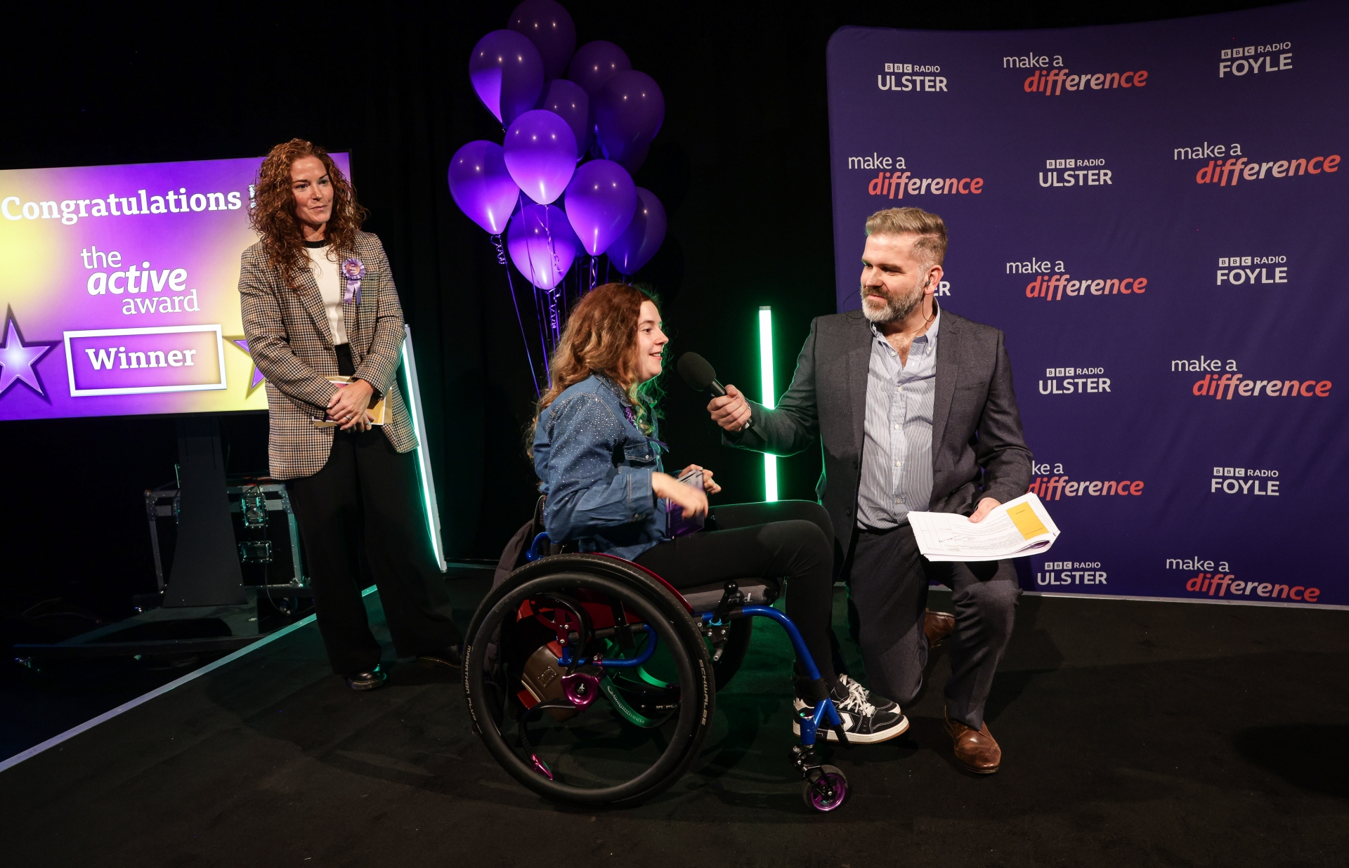 Jennifer Smyth, Derry, who was winner in the Active Award category at the BBC Making a Difference Awards on stage with BBC Radio Ulster presenter, Vinny Hurrell and category judge, Marissa Callaghan.