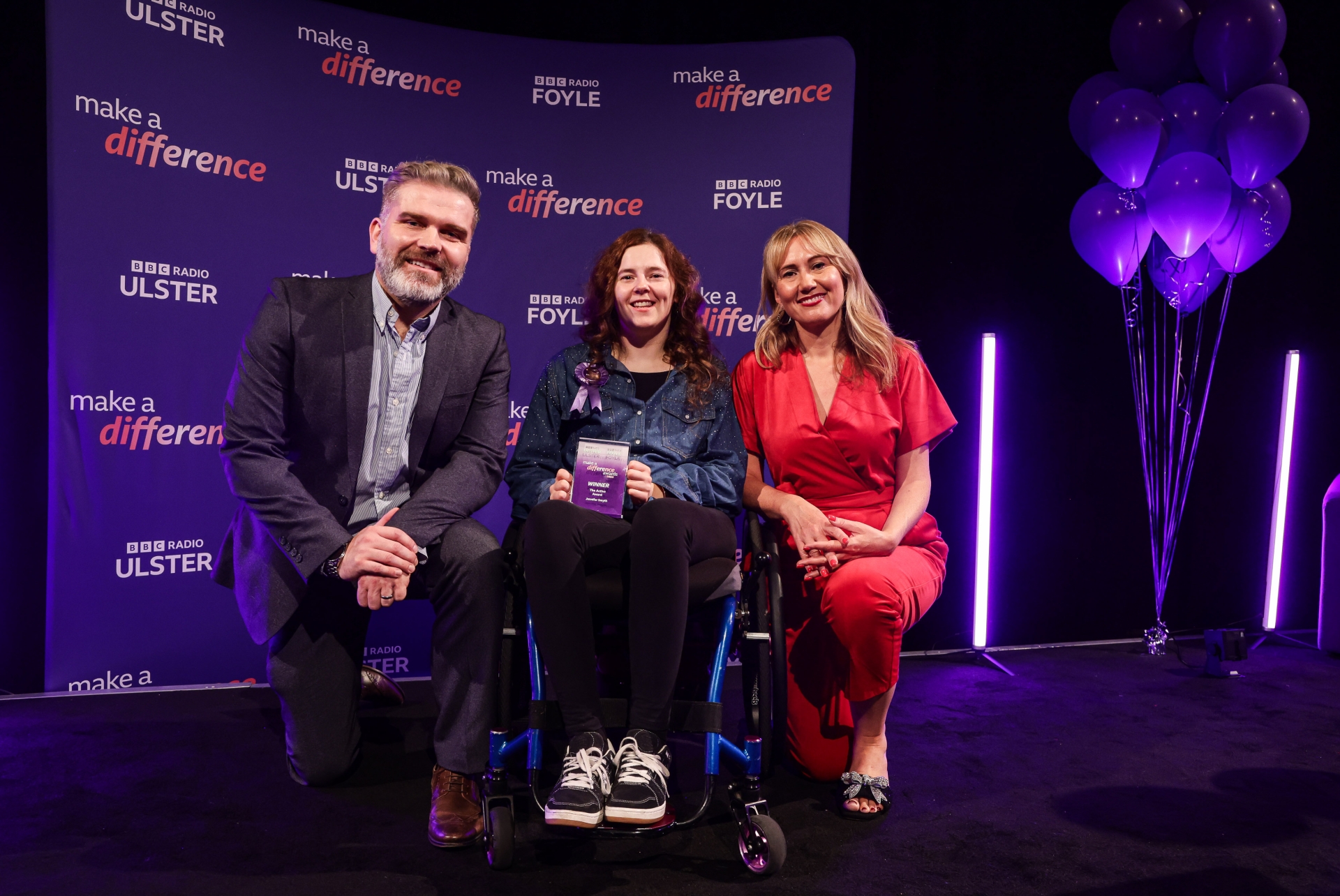 Jennifer Smyth who was winner in the Active Award category at the BBC Making a Difference Awards on stage with BBC Radio Ulster presenters Vinny Hurrell and Cate Conway.