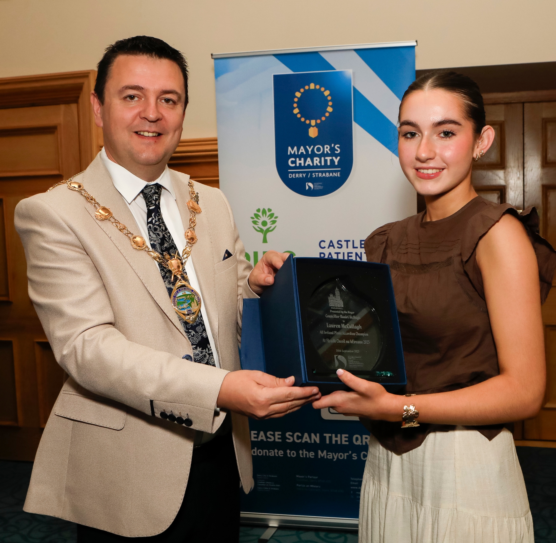 Mayor Ruairí McHugh making a presentation Lauren McCullagh in recognition of her achievement in winning the All-Ireland Championship on piano accordion at the All Ireland Fleadh Cheoil held in Wexford. (Photos - Tom Heaney, nwpresspics)