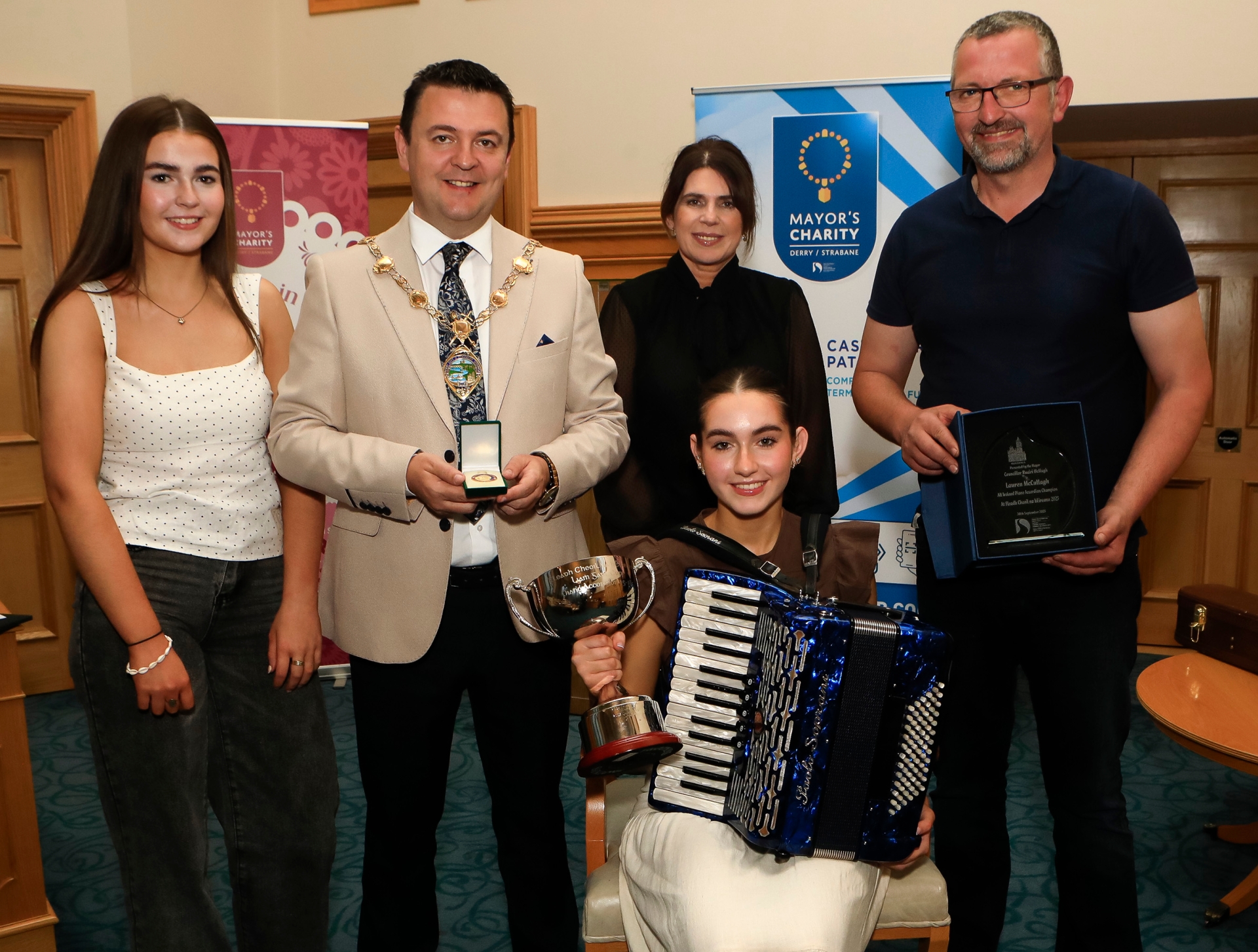 Mayor Ruairí McHugh who held a civic reception for Lauren McCullagh in recognition of her achievement in winning the All-Ireland Championship on piano accordion at the All Ireland Fleadh Cheoil held in Wexford. Included from left are sister Mia and on right, dad Declan and mum Mairead. (Photos - Tom Heaney, nwpresspics)
