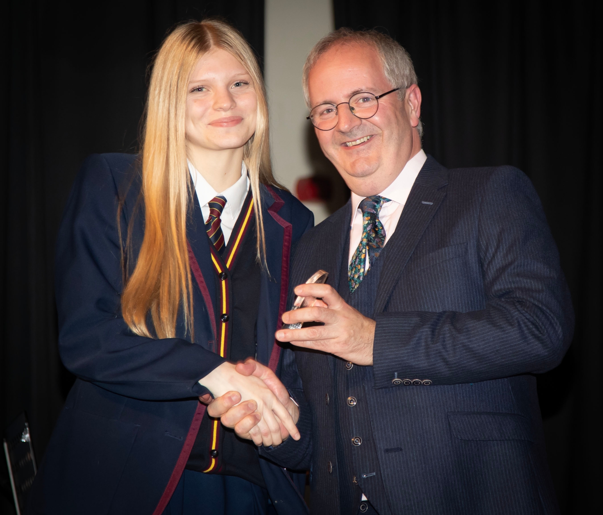 Evie Birch receiving the Rugby Award from Principal, Mr. John Harkin.