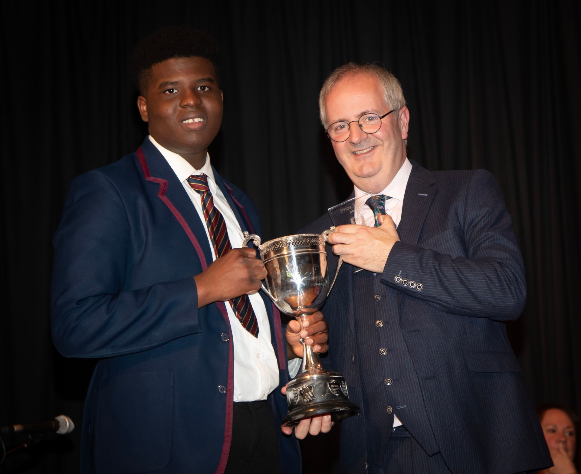 David Lawal pictured with Principal Mr Harkin. David received curriculum awards for Design & Technology, Geography, Maths Double Award Science, Religious Education and Overall Academic Excellence.