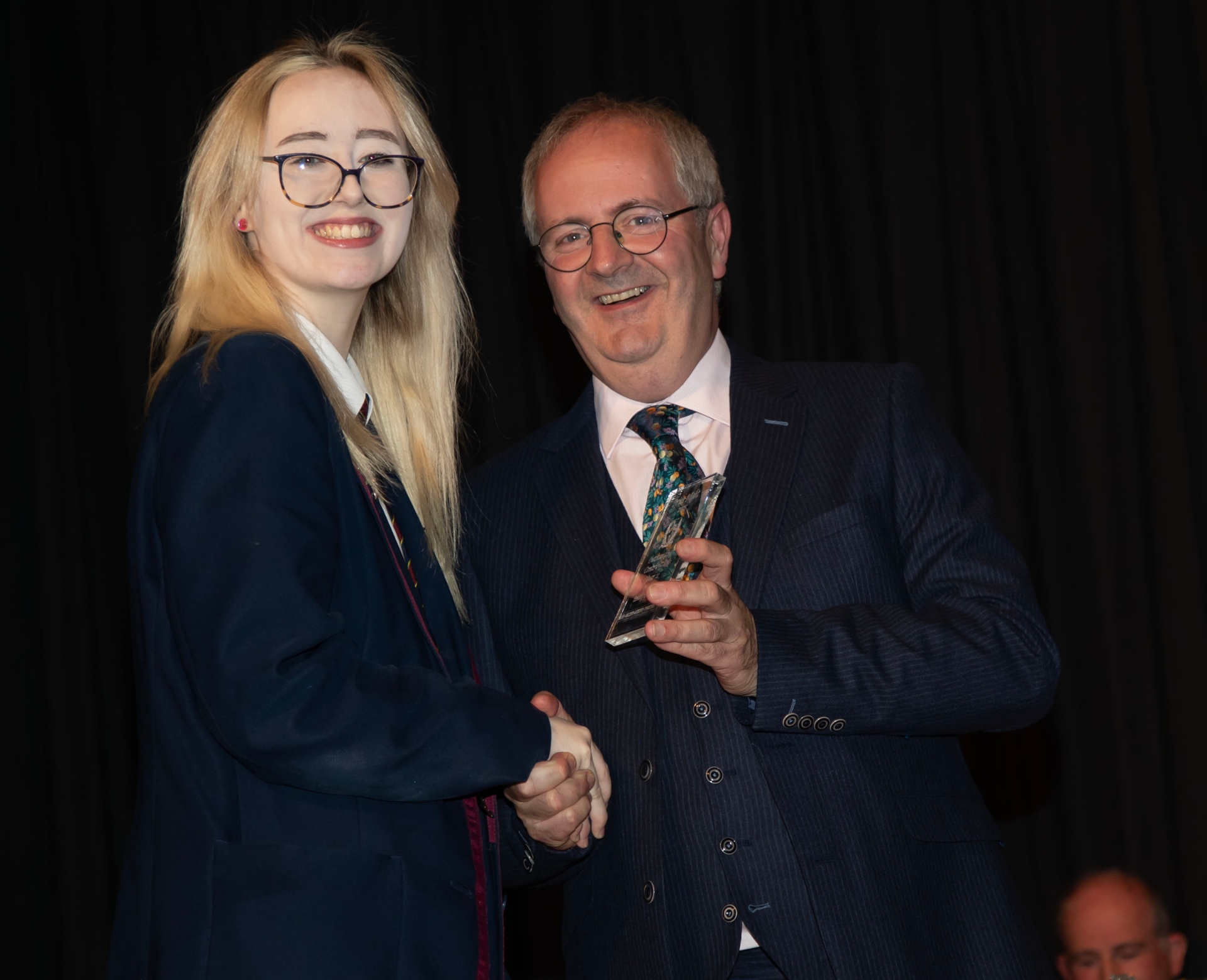 Emily Boyle receiving curriculum prizes for Business Communication Studies, French and Performance Arts from Mr. John Harkin, Principal, Oakgrove Integrated College.