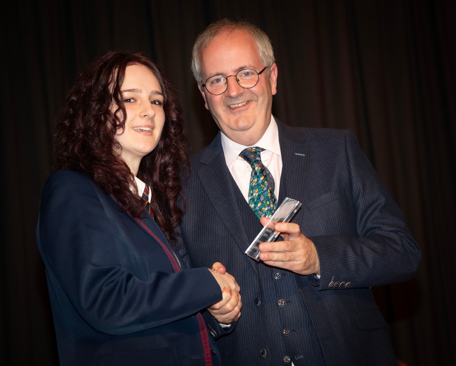 Victoria Symslowska receiving her award for Outstanding Contribution to Year 13 from Mr. John Harkin, Principal.