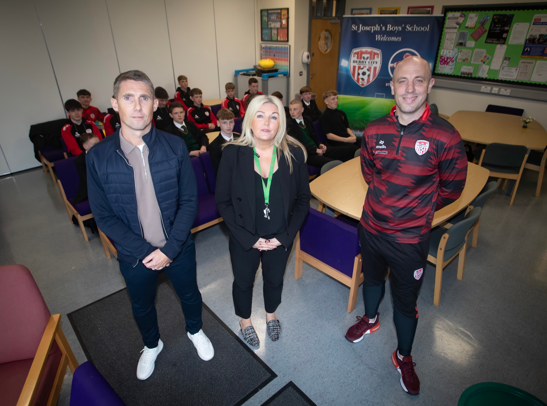 Mrs. Ciara Deane, Principal, St. Joseph's Boys School pictured with Daniel Harrison, Director of Operations, Steven Gerrard Academy and Mark McCrystal, Technical Director, Derry City FC at the school.