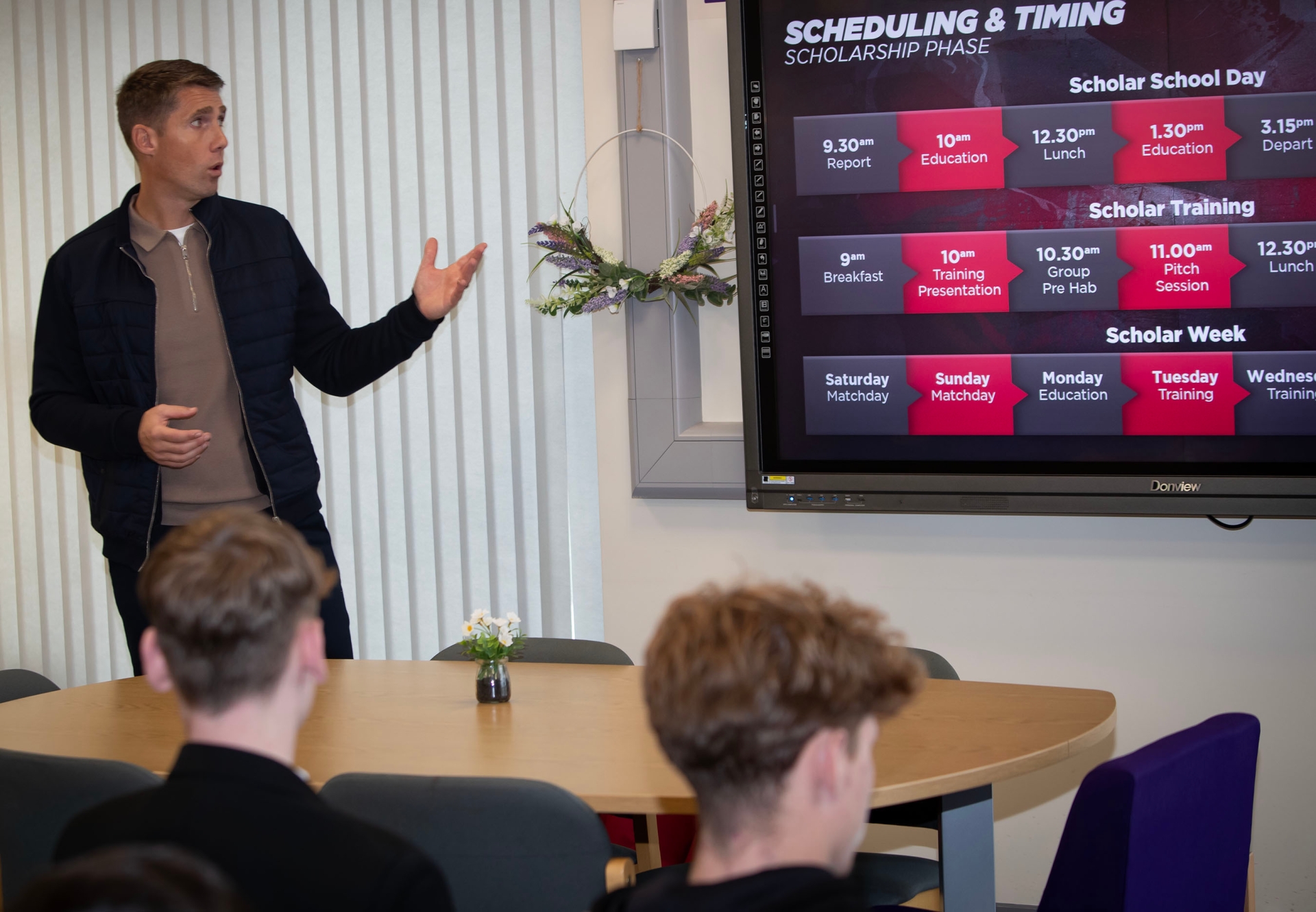 Daniel Harrison, Director of Operations, Steven Gerrard Academy explaining the scheduling and timing of the scholarship phase of year's programme to students. (Photos: Jim McCafferty Photography)