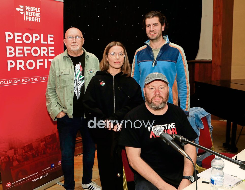 Chris McKeown, chair with speakers, from left, Rev. Bill Shaw,Catherine Pollock and Davy McAuley at the "Think Left" event "Rotten Prods" & Palestine : Why Unionist Politicians Always Back the Wrong Side" held in St. Columb's Hall. (Photos - Tom Heaney, nwpresspics)