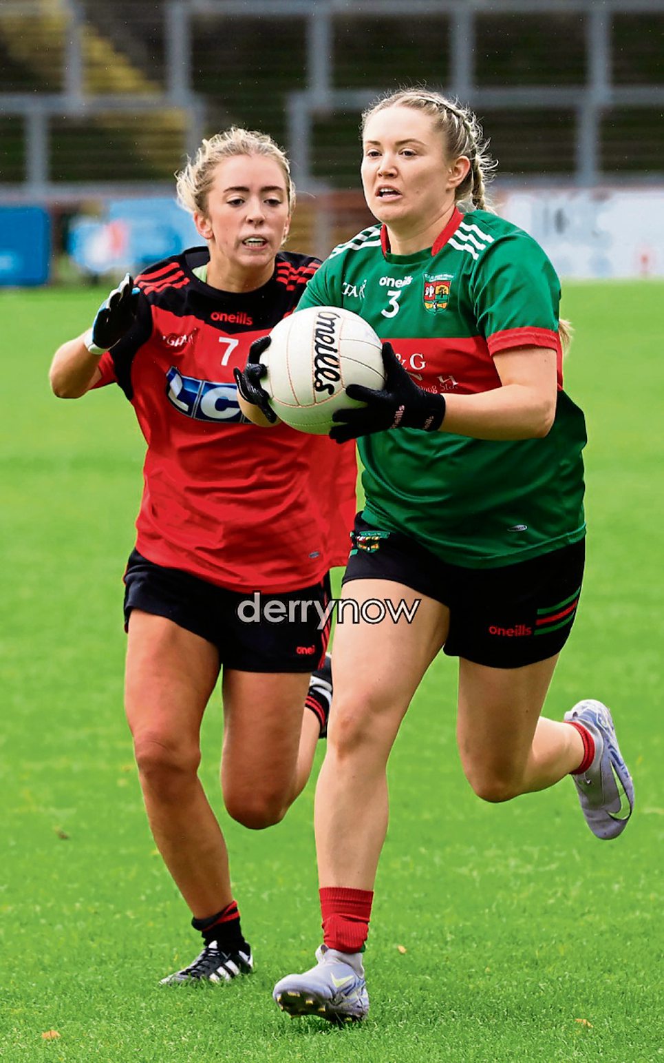 Slaughtmanus' Gemma Devine powers forward with Lissan's Grace Loughran on her heels.