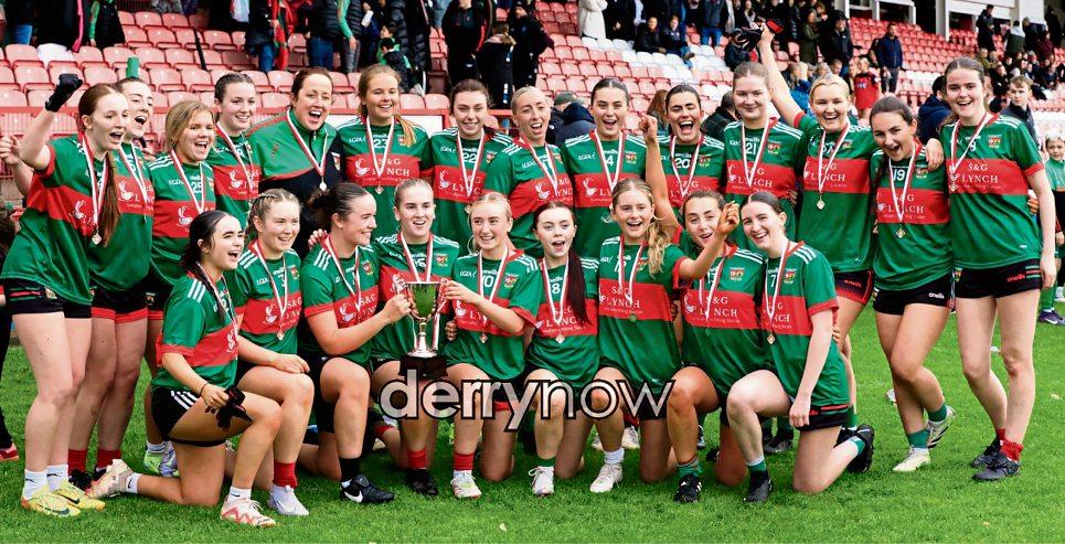 Slaughtmanus team celebrating beating Lissan in the Ladies GAA JFC B final at Celtic Park on Sunday. (Photos - Tom Heaney, nwpresspics)