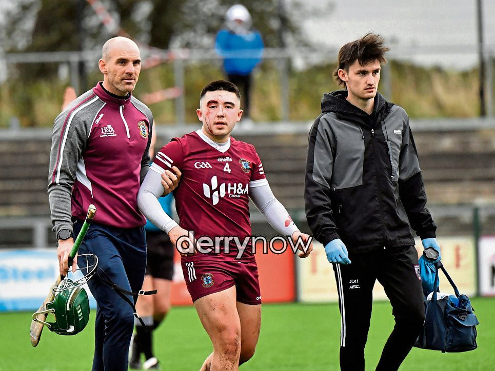 Ballinascreen’s Andy McBride leaves the pitch with a facial injury.