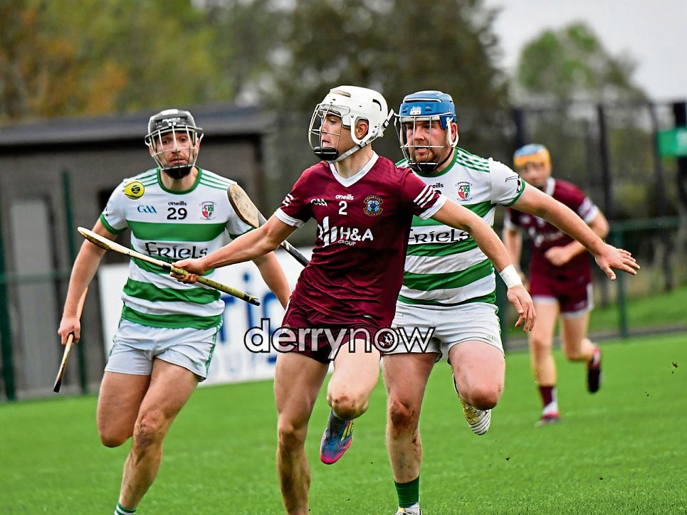 Ballinascreen’s Jamie Lee McGlade keeps control of the sliothar under pressure. (Photos: George Sweeney / nwpresspics)