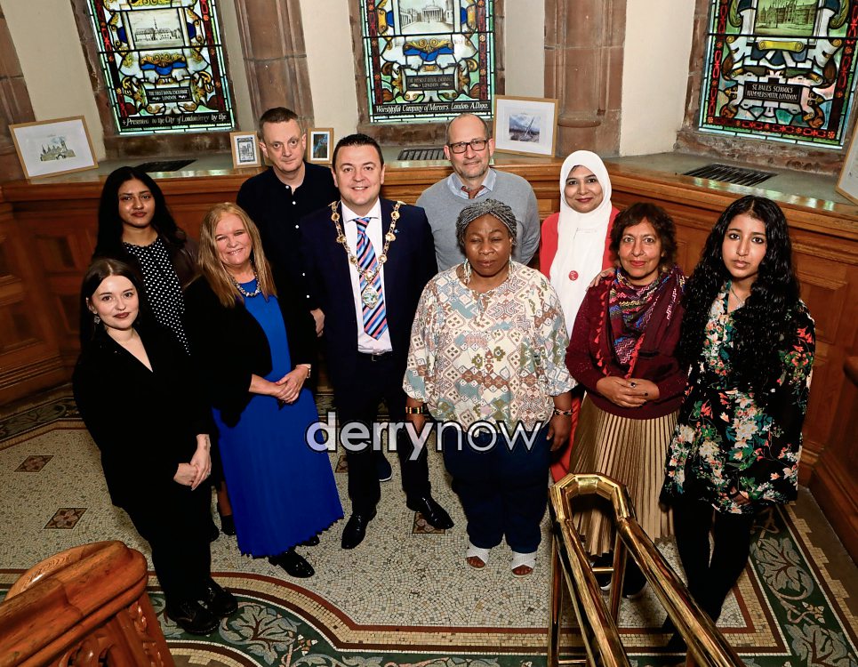 Mayor Ruairí McHugh at the launch of the Bloody Sunday Trust - NW Anti-Racism Charter held in the Guildhall. From left, are Constance Lambert (BST), Sumyrah Khan Maeve McLaughlin (BST), Conor Sharkey (NW Migrants Forum), Shane O Curry, Beverley Simpson, Fahmeda Naheed, Anu Mario, and Emaan Naheed. (Photos - Tom Heaney, nwpresspics)