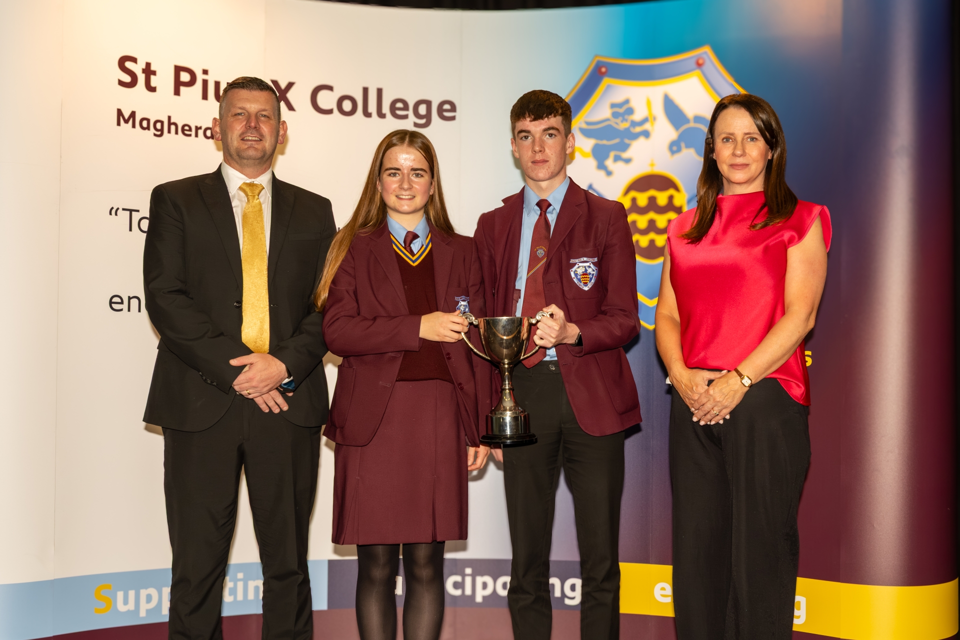 The KS3 Cup for Leadership was presented to Katherine and Luke. They are pictured here with Ms McNulty and Mr Doyle