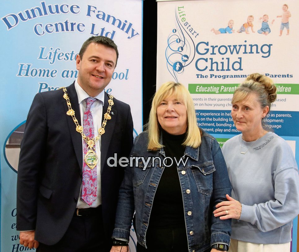 Mayor Ruairí McHugh pictured with Jackie Taylor and Carla Nash, Dunluce Family Centre, Lifestart.