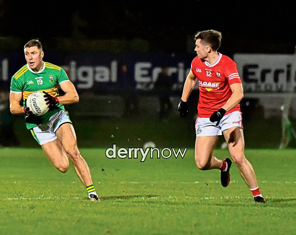 Glen's Ciaran McFaul evades a tackle from Magherafelt's Paddy McLaronon. (Photos: nwpresspics)