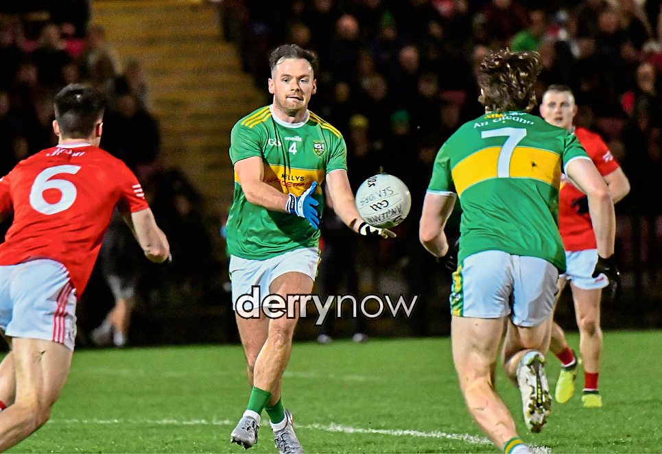 Conor Carville of Glen passes the ball to teammate Ethan Doherty.
