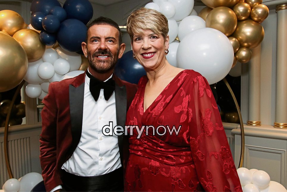 Mickey Doherty, Host and Shiela Duffy, Foyle Hospice pictured at the 40th Anniversary Charity Ball.