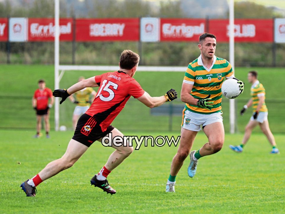 Glenullin’s Neil McNicholl looks for support as Greenlough's Ryan Tohill closes in, in the Derry Intermediate Football Championship semi-final at Owenbeg.