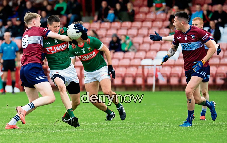 Slaughtmanus’ Conor Lyons in a battle to hold onto the ball with Glack’s Padraig Morgan.