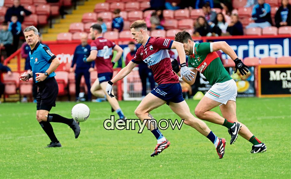 Glack’s Finbar O’Brien races forward to pick up the ball in the Derry GAA Junior Football Championship semi-final.