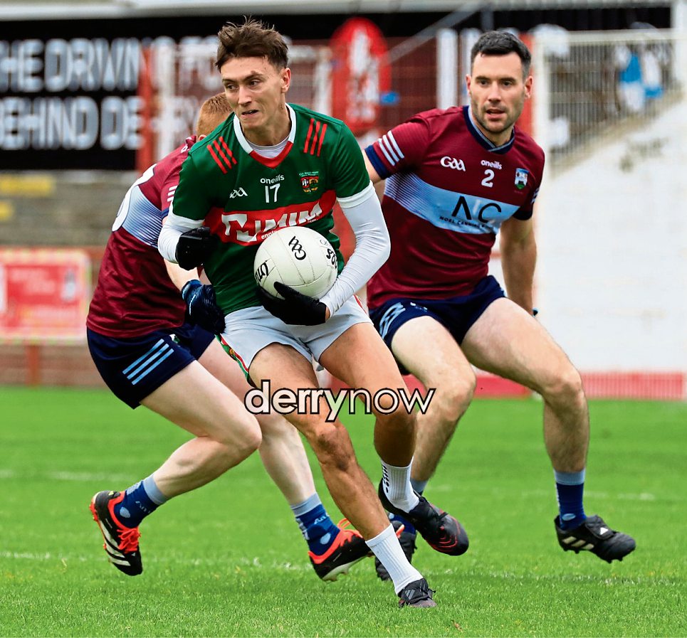 Slaughtmanus’ Conor McGee in action against Glack in the Derry GAA Junior Football Championship semi-final at Celtic Park on Saturday. (Photos - Tom Heaney, nwpresspics)