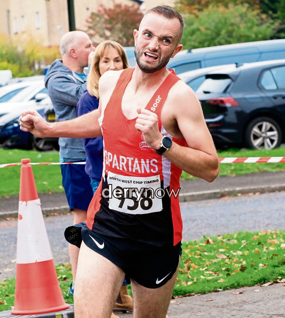 City of Derry Spartans Aaron McCauley heading for the finish line to win Marty's Run 2025.