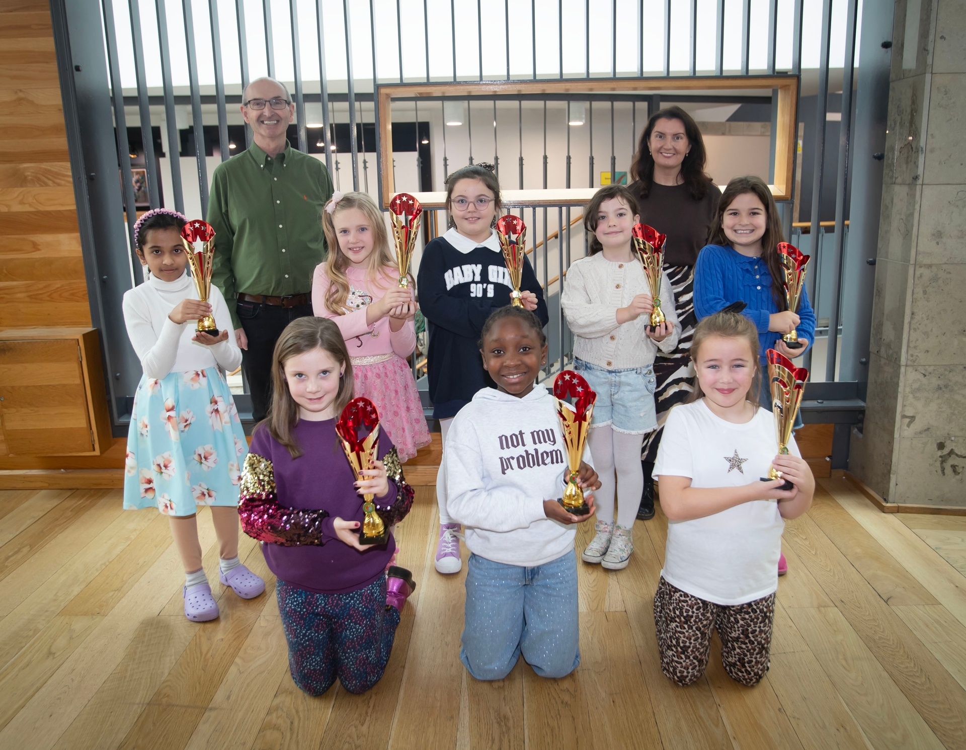 Adjudicators Gerry Guckian and Blathnaid Biddle pictured with a selection of prizewinners at Saturday's Feis.