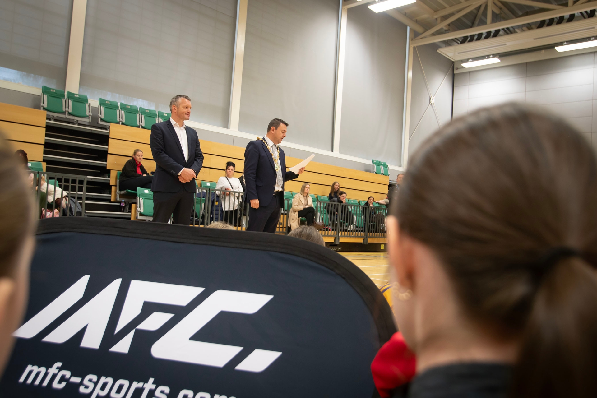 The Mayor, Ruairi McHugh and County Board CEO Stephen Barker address the attendance at the launch of the MFC's Ogra Gael Investment Initiative in Primary Schools Gaelic Games in the city, held at the Foyle Arena on Friday afternoon.
